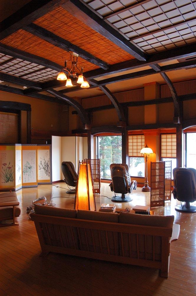 パブリックスペースには広いフロアにマッサージチェアそしてヒーリング音楽が漂う。地下水を汲んだレモン水が用意され、風呂上りにここで気の利いた時間を過ごせる。