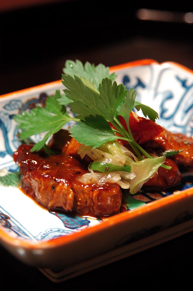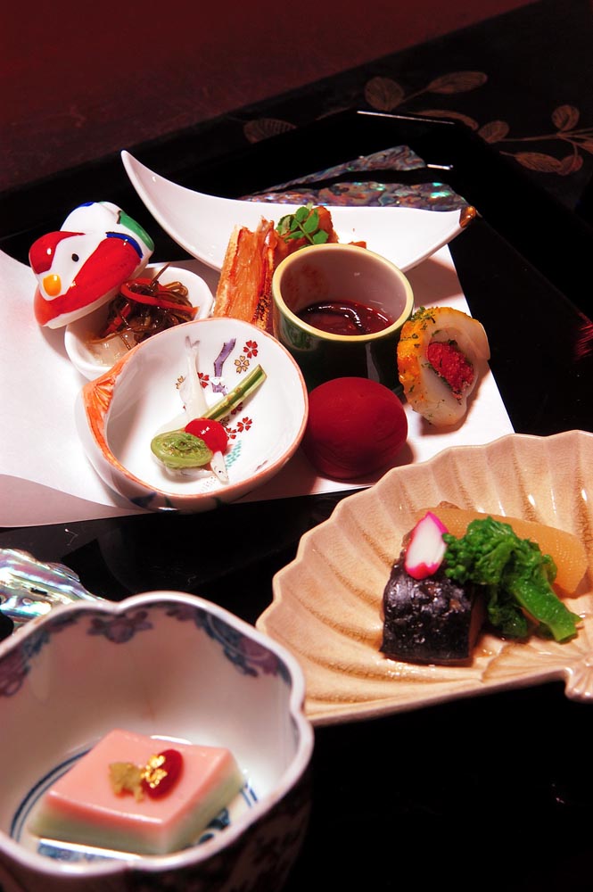 古い町並みが残る飛騨古川には奥飛騨の雪解け水がふんだんに注ぎ込まれ、清冽な水路に鯉が泳ぐ(ちなみに冬季は別のところへ移されている)。お寺のより高い屋根がないらしく、奥飛騨の山並みを借景に寺の屋根の優雅な曲線が映える。2軒の造り酒屋と珍しい手づくり蝋燭の店などがあり、そぞろ歩きが何より楽しい。NHK連続テレビ小説の舞台になった町だ。近くには飛騨高山という人気の観光地もあるが、人ごみを逃れたい私たちは、飛騨古川は穴場の町だ。宿を訪れたときはちょうどひな祭りの頃。温もりある木造の風合いの中、明治から平成までの雛が館内の6箇所に飾られていた。歴史のある宿と聞いていたがソフト面ではなかなか細かい気遣。バスタオルは風呂場に用意されていたり、館内で過ごす用と、寝るときのために浴衣は2枚用意されていたり、夜食にクマザサに包まれたおこわでニヤリとさせてくれたり、朝食後も布団は敷きっぱなしにしてゴロリできたり、今の時代の個人客の気持ちをよく分かっていてくれる。それは若主人と若女将がいろいろな宿を客として泊まりにいっている所為かな。とはいってもこの宿の肝はやっぱり料理。個室の食事どころで一品出し。案内された個室はなぜか電気が消灯していて、代わりに飛騨古川名物の手づくりろうそくが灯っていた。その窓越しに雪吊りされたライトアップされた庭園。すばらしい光の演出に早速上機嫌。季節感を大事にし、土地の山野菜と郷土のたまり醤油、海のものは地の利を生かして富山湾の幸を見事にまとめる。器にも神経が注がれている。季節はちょうどひなまつり。膳を飾る素朴で華やいだ雰囲気に知らずにウキウキ。造りはカンパチ、マグロに赤貝。刺身醤油はどろりとした高山のたまりで。きれいな色をした餡かけの桃饅頭を割ってみるとすりつぶした山芋と百合根に穴子が混ぜてあり、ちょうどかぶら蒸しみたいな感じ。きめの細かい顆粒感が滑らかに舌の上に漂う。飛騨の山のもの、富山湾の海の幸、そして古川のたまりが季節感豊かに合わさって絶妙。季節を感じ、食材に感謝している料理人の気持ちが伝わる。古川にある2つの酒蔵の地酒もぜひ飲み比べたい。もうひとつおもしろい催しがあるが、これは実際に訪れたときのための楽しみにと言うことで・・・。