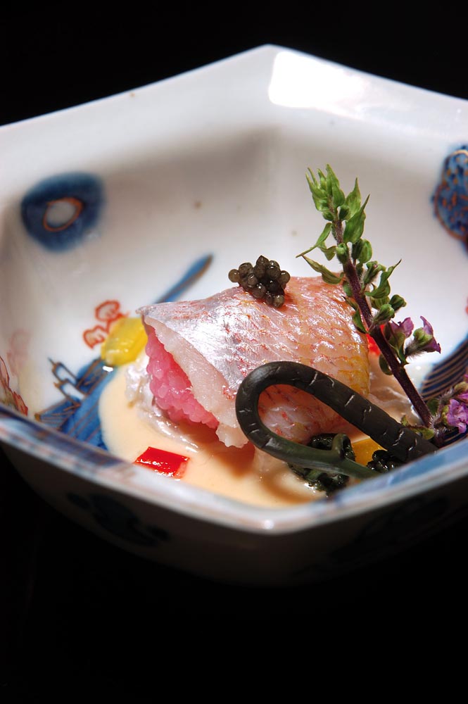 道明寺鯛包みゴマたれは桜風味に色と香りをつけた寿司を鯛でつつむ。ゴマだれが口福な味に纏め上げる。ひな祭りの季節によくあう素敵な一品。