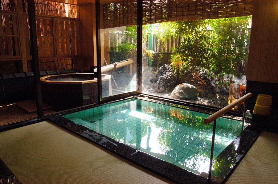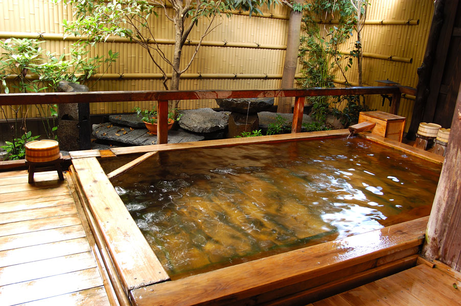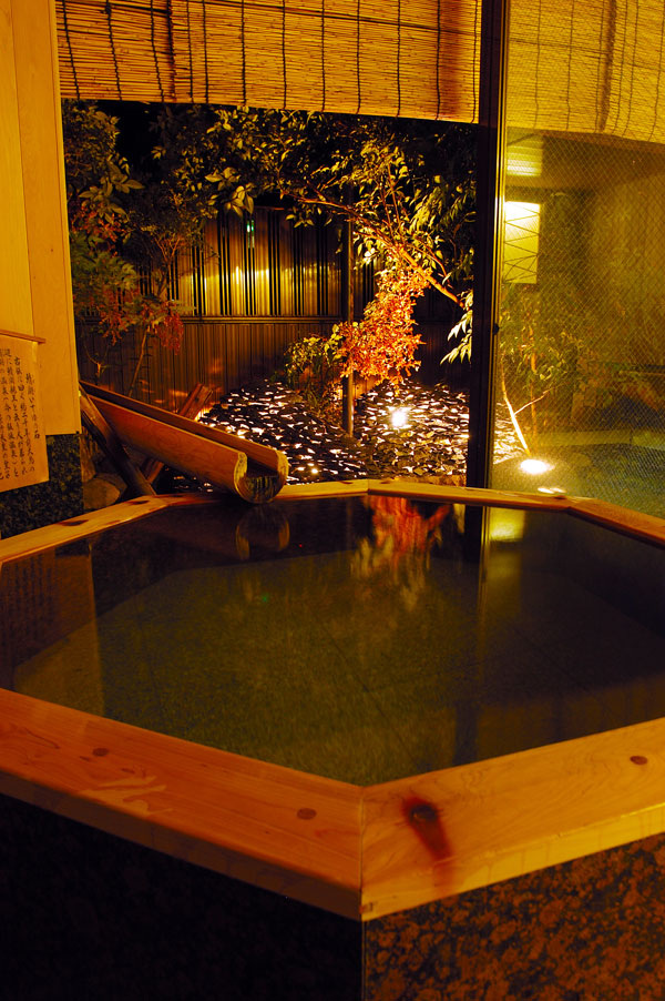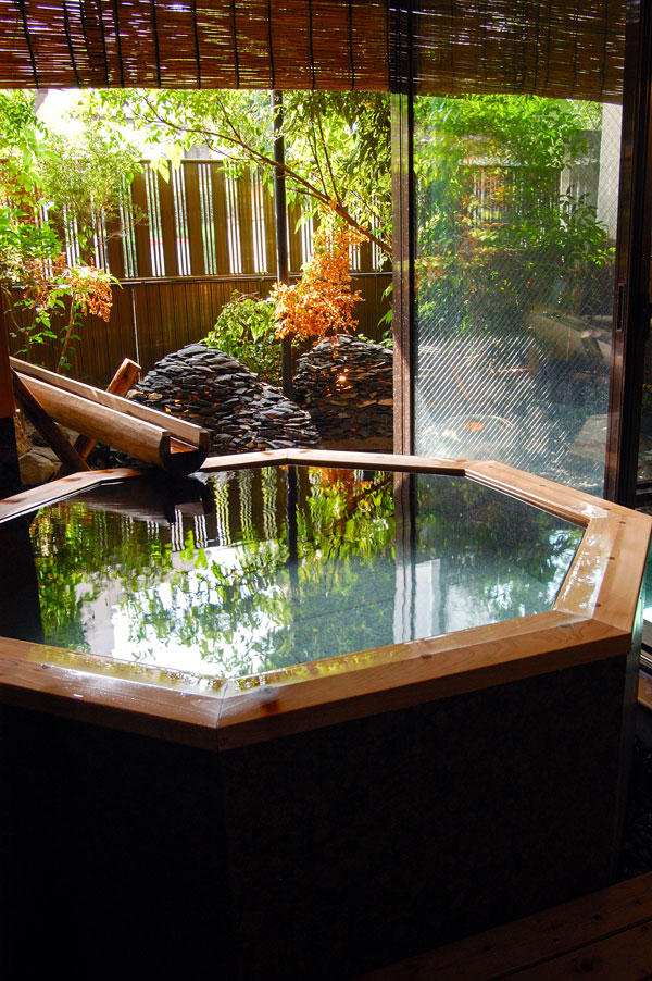 外界からほどよく遮断されたお風呂は箱庭を思わせ、木々が湯面を緑にし、ゆらゆらゆれている。湯につかり水面に鼻を近づけると桧の香り。体の細胞が目を覚ましていく感じがした。