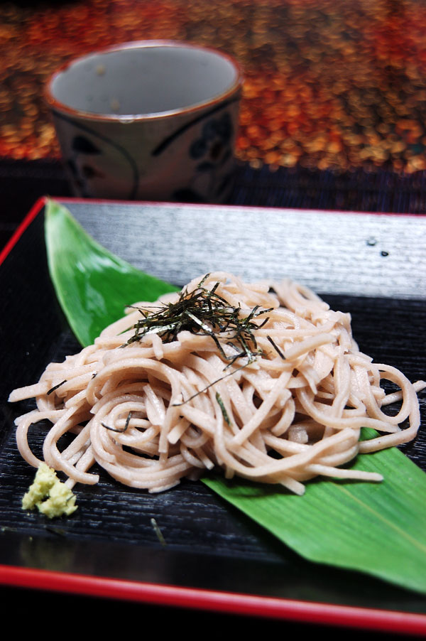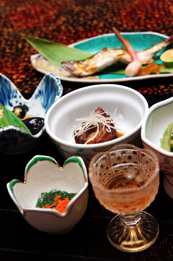 料理のメニューに決まったものはなく、その日入手した素材から決まっていく。毎日が真剣勝負だ。この日は自家製カリン酒にはじまり、天然ものの鯛と甘えびの造り、ひめ竹(地竹)、ごまどうふとじゅんさい、福島牛のすきやき、今回は特に豚の角煮が旨かった。締めくくりに女将さんの手打ち蕎麦を頂いた。