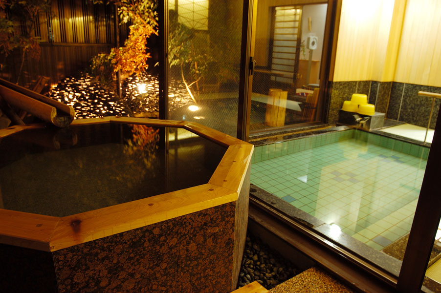 まずは石灯りの湯へ行ってみる。内風呂、露天風呂、足湯がそろった多彩なお風呂。露天へは、古の鯖湖湯で使われていた湯石から湯が注がれている。御影石の床は、肌に触れたときの感触が石とは思えないほど柔らかい。鯖湖湯ではじっくりつかれなかった分、ここで湯を楽しんだ。