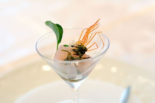 アミューズは甘えびとゼリー。甘えびはただの刺身ではなく何かで仕事がしてあるみたいで、とてもおいしかった。ひげの部分は揚げてありこれも香ばしくいただいた。