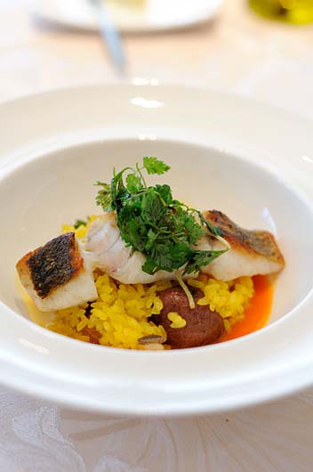 魚料理はサフランライスのリゾットで上にスズキ?(たぶん)がのっています。