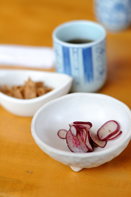 突き出しは蕎麦のせんべいと漬物。うまいねこれ。
