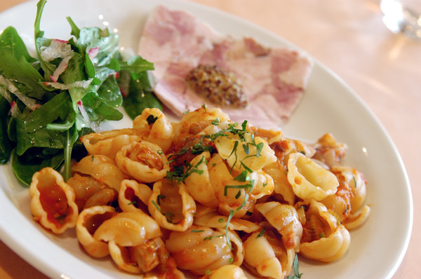 本日のパスタは氷見漁港(地元!)直送のブリをトマトソースで絡めた貝殻状のパスタ、